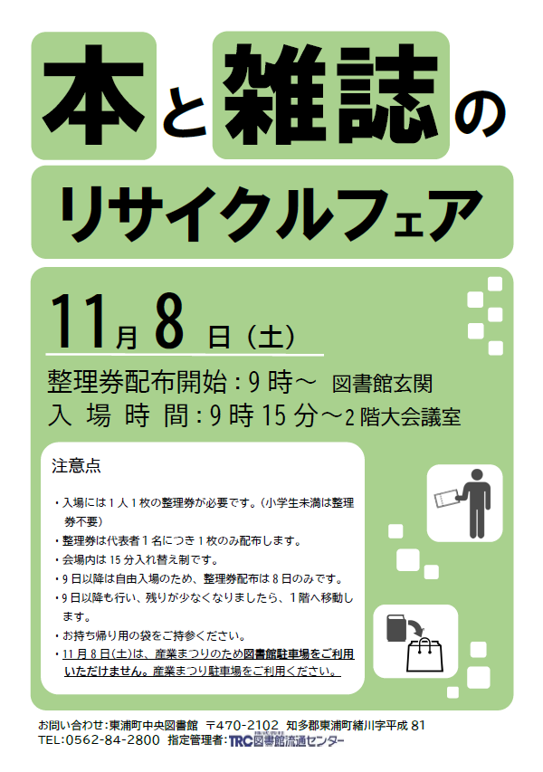 ・11月8日(土)は午前9時から図書館玄関前で整理券を配付します。