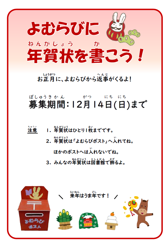 ② 年賀状はカウンター前にある「よむらびポスト」へ入れてね。ほかのポストへは入れないでね。