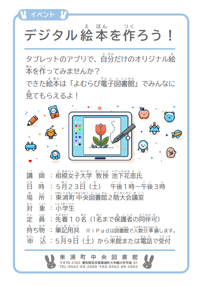 タブレットのアプリで、自分だけのオリジナル絵本を作ってみませんか?できた絵本は「よむらび電子図書館」でみんなに見てもらえるよ!